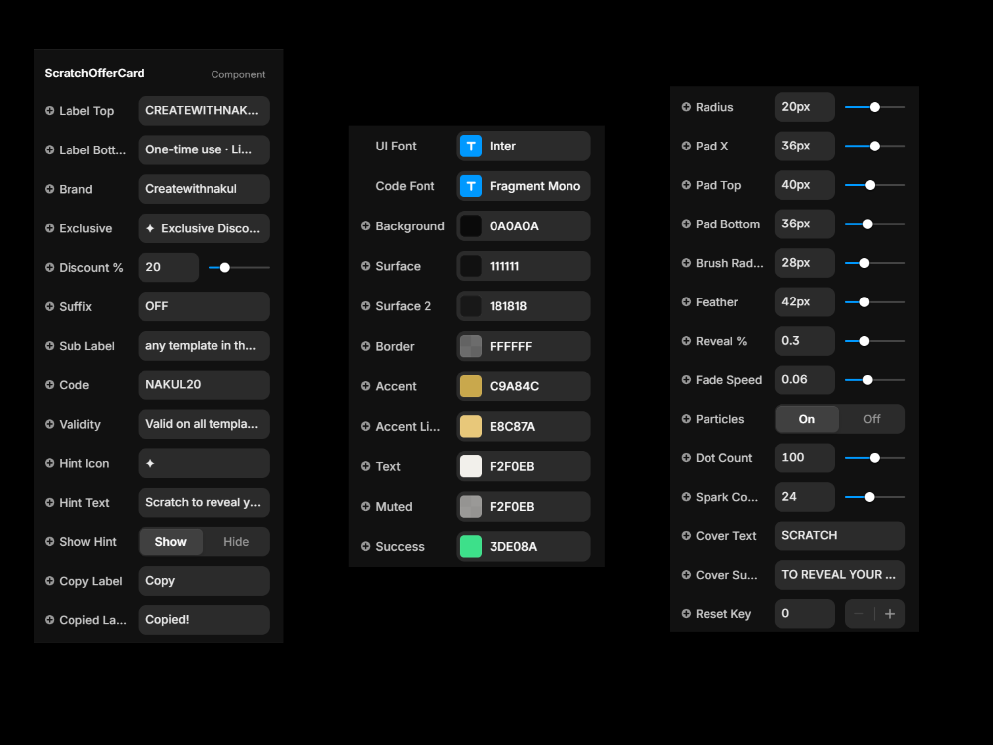 The brain can't leave an incomplete task alone. it's called the Zeigarnik Effect. A scratch card turns your offer into a tiny mission users need to finish. That compulsion drives dwell time, engagement, and the kind of micro-delight that makes people share your page. Drop this onto any Framer canvas, set your coupon code and headline, tune the reveal threshold, and your next launch has an interaction worth remembering. After scratching past the threshold, a premium dark card surfaces. showing your discount value, coupon code, and a one-click copy button. Fully customizable: swap in your own code, headline, sub-text, and brand colors.