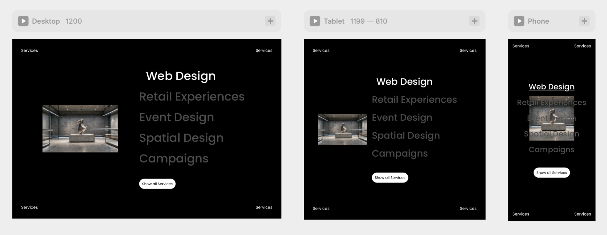 The component comes with three built-in breakpoints — desktop, tablet, and mobile. Layouts adapt automatically so your service section looks polished on every device, without any extra configuration.