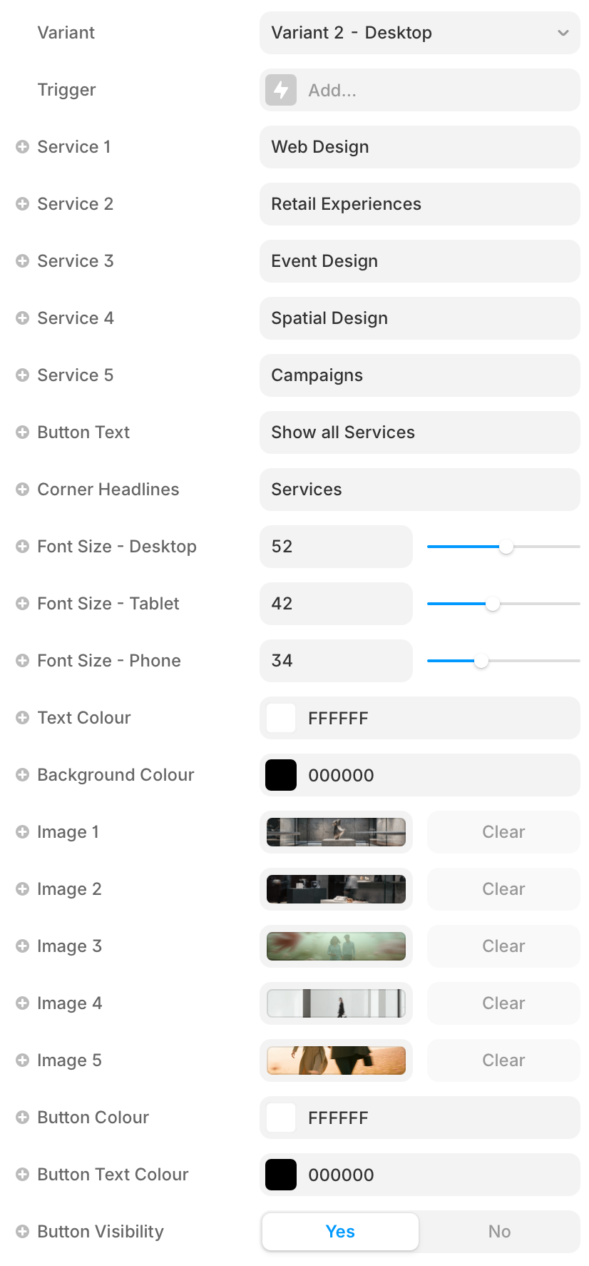 Customize everything directly from the right panel — edit all service headlines, Images, Colours, Buttons etc. without entering the component.