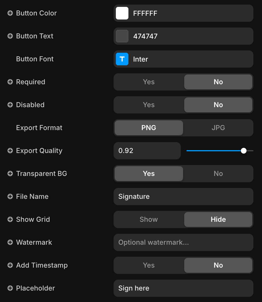 Export Options – Save signatures as PNG or JPG with quality, transparency, and filename control