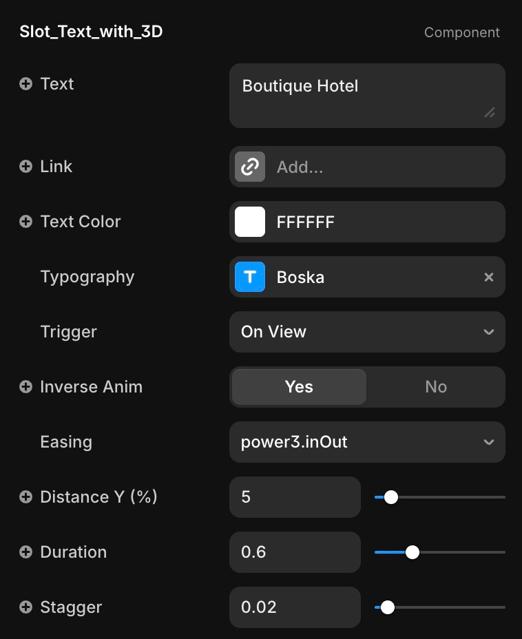 Smart Triggers: Choose between "Hover" for interactive engagement or "On View" to automatically trigger the 3D animation as soon as the text enters the viewport.