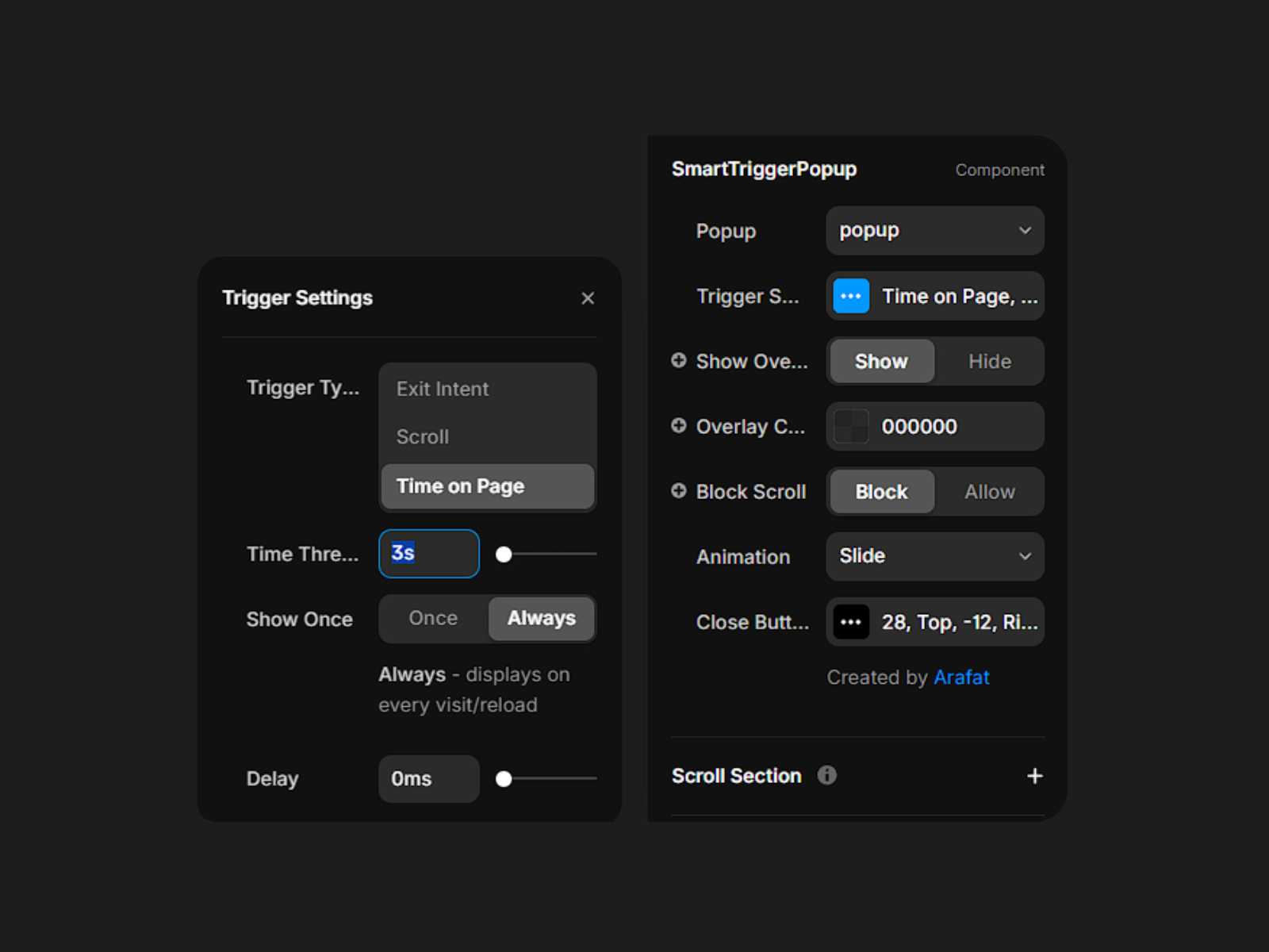 Design your popup in the canvas and connect it to this component to control when it appears - based on scroll, time delay, or exit intent. Best of all, it can dynamically detect returning visitors, ensuring the popup shows only when it’s most relevant.