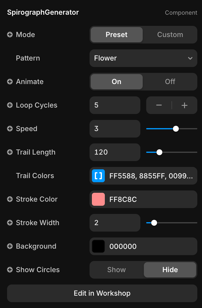 I created this dynamic Spirograph component that continuously loops in a mesmerizing display of colorful trails and fluid motion. What makes it even more exciting is how interactive it is—you can take full control of every aspect of the design. Adjust the size to scale your patterns from delicate mini loops to large, sweeping arcs. Modify the number of points to shape the complexity of the pattern, or fine-tune the radius and pen distance to change how each curve intertwines. You can even customize the loop cycle speed to make the motion slow and meditative or fast and energetic. And with full control over the color trails, you can create anything from soft pastel gradients to bold, neon bursts. It’s a living, breathing piece of generative art that responds to your creativity—endlessly looping, endlessly unique.