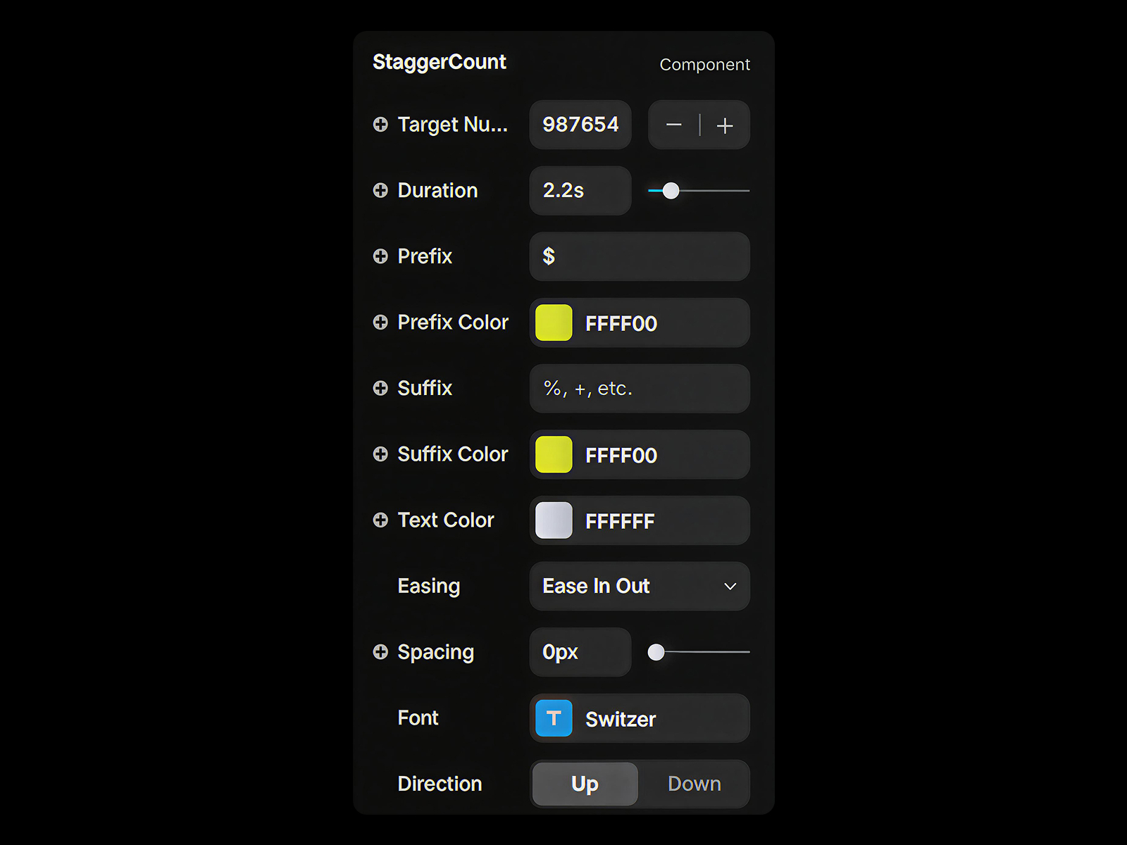 A smooth animated counter where each digit transitions with a staggered directional motion. Fully customizable with target number, duration, font, color, spacing, prefix, suffix.