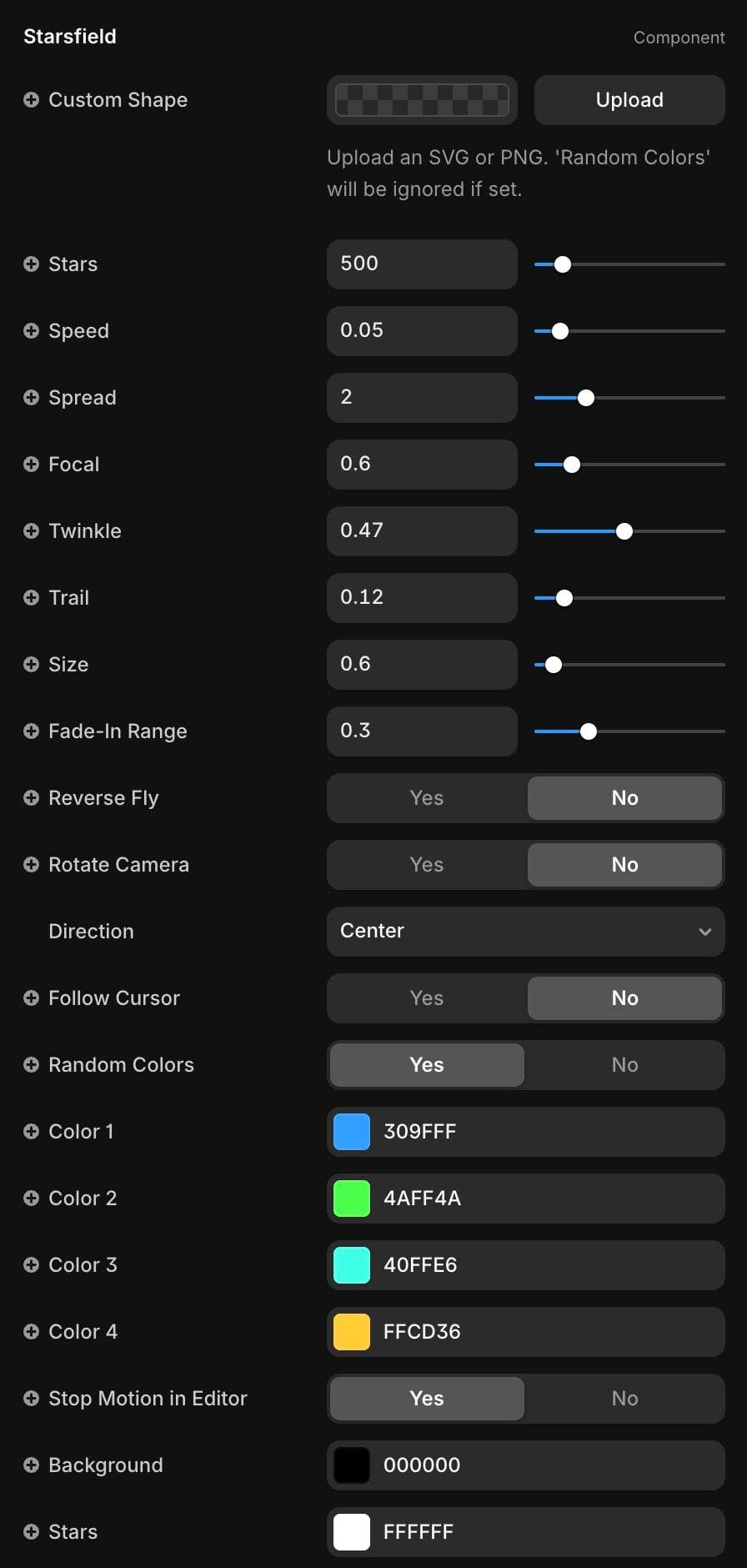 Infinite forward camera motion toward center. Stars twinkle and leave short motion trails. Background and star colors are customizable.