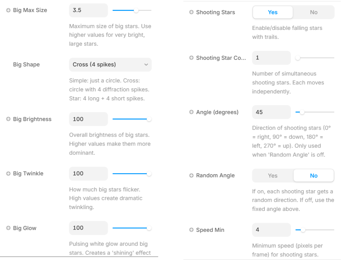 From subtle atmospheric glow to dramatic shooting stars, every detail is engineered to create depth, motion and realism without slowing down your site.