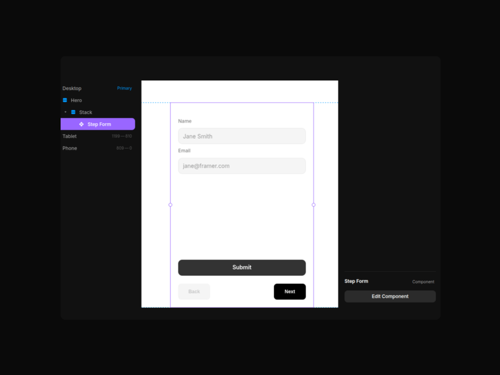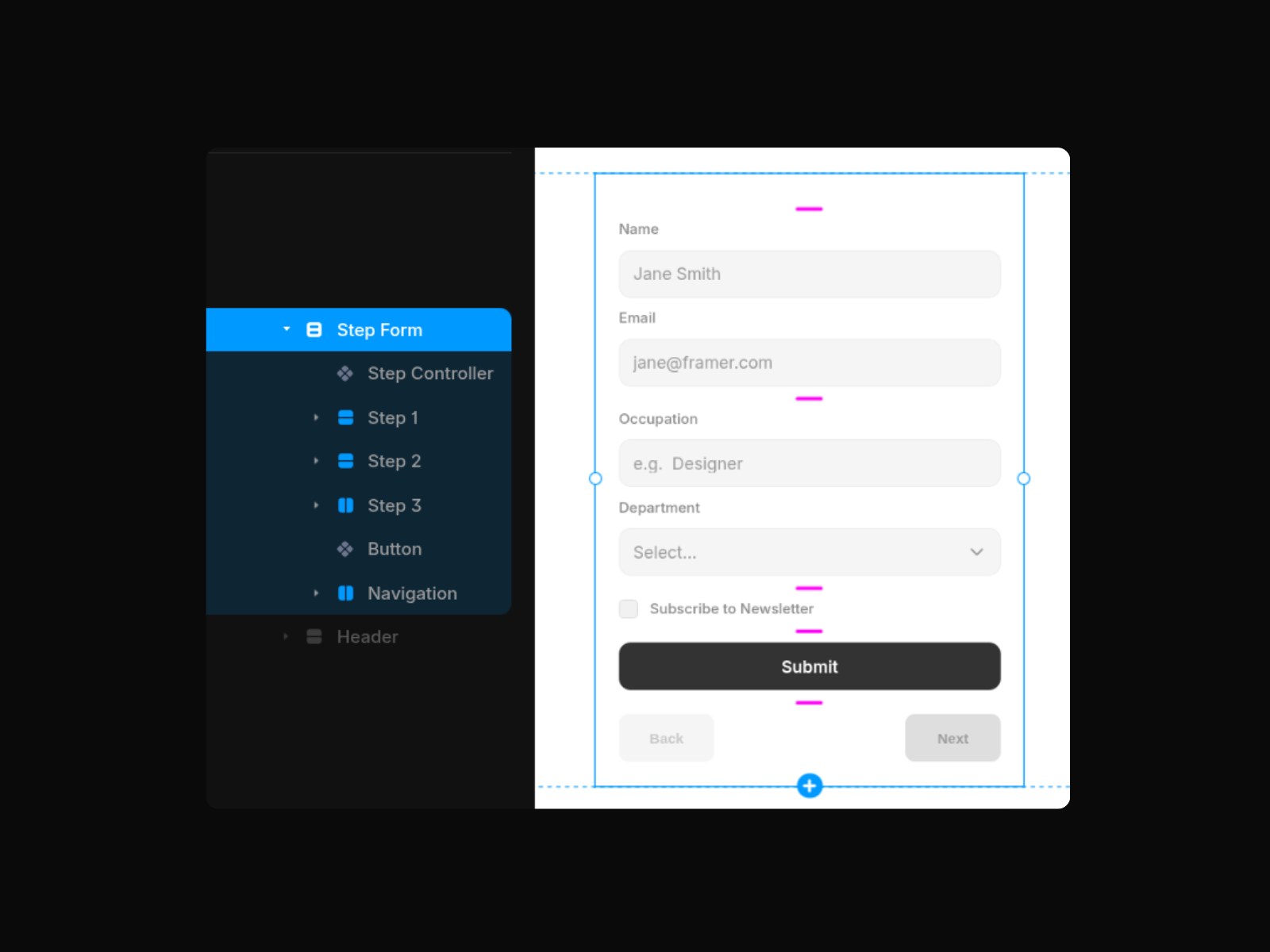 Create structured multi-step forms using Framer’s native form components. This builder transforms a standard form into a guided step-by-step experience while keeping full native submission support.