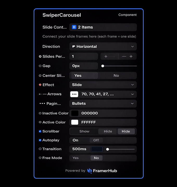 Slot-Based Content Connect any frame or component to the carousel slots for total design flexibility. Support for multiple slides per view and custom gap settings.