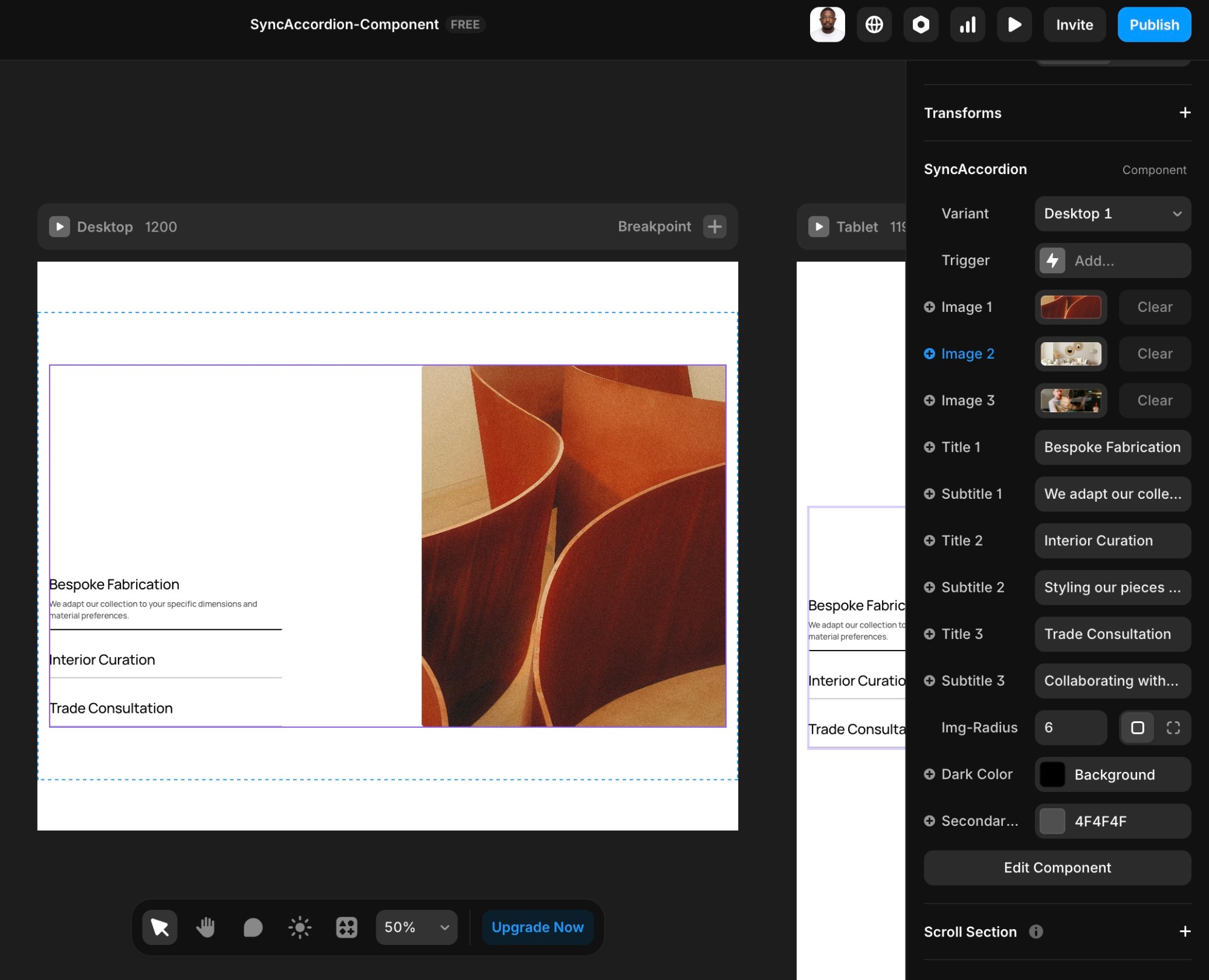 Synchronized Media: The media container instantly crossfades to match the active accordion tab.