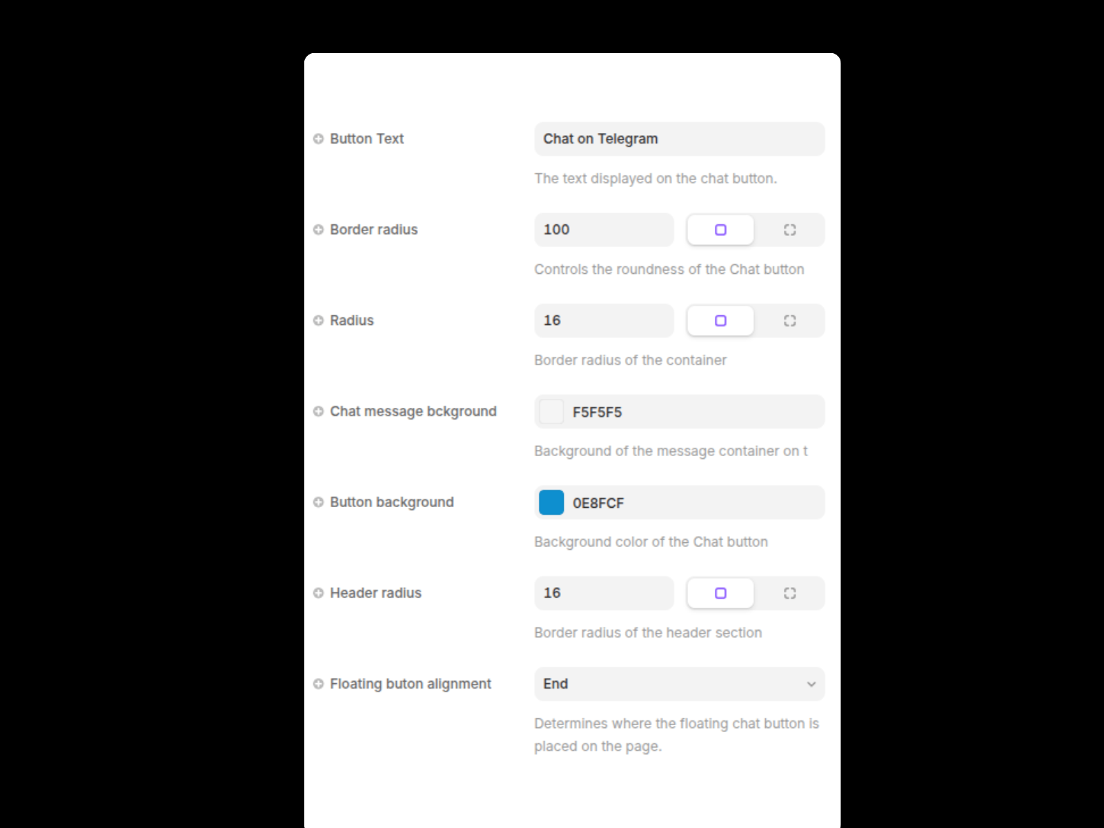 Button Styling: Customize the button’s background color (default Telegram blue #3B82F6), text color, font, border radius, and icon color.