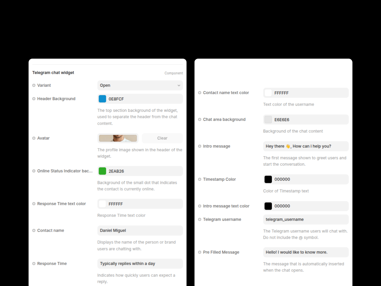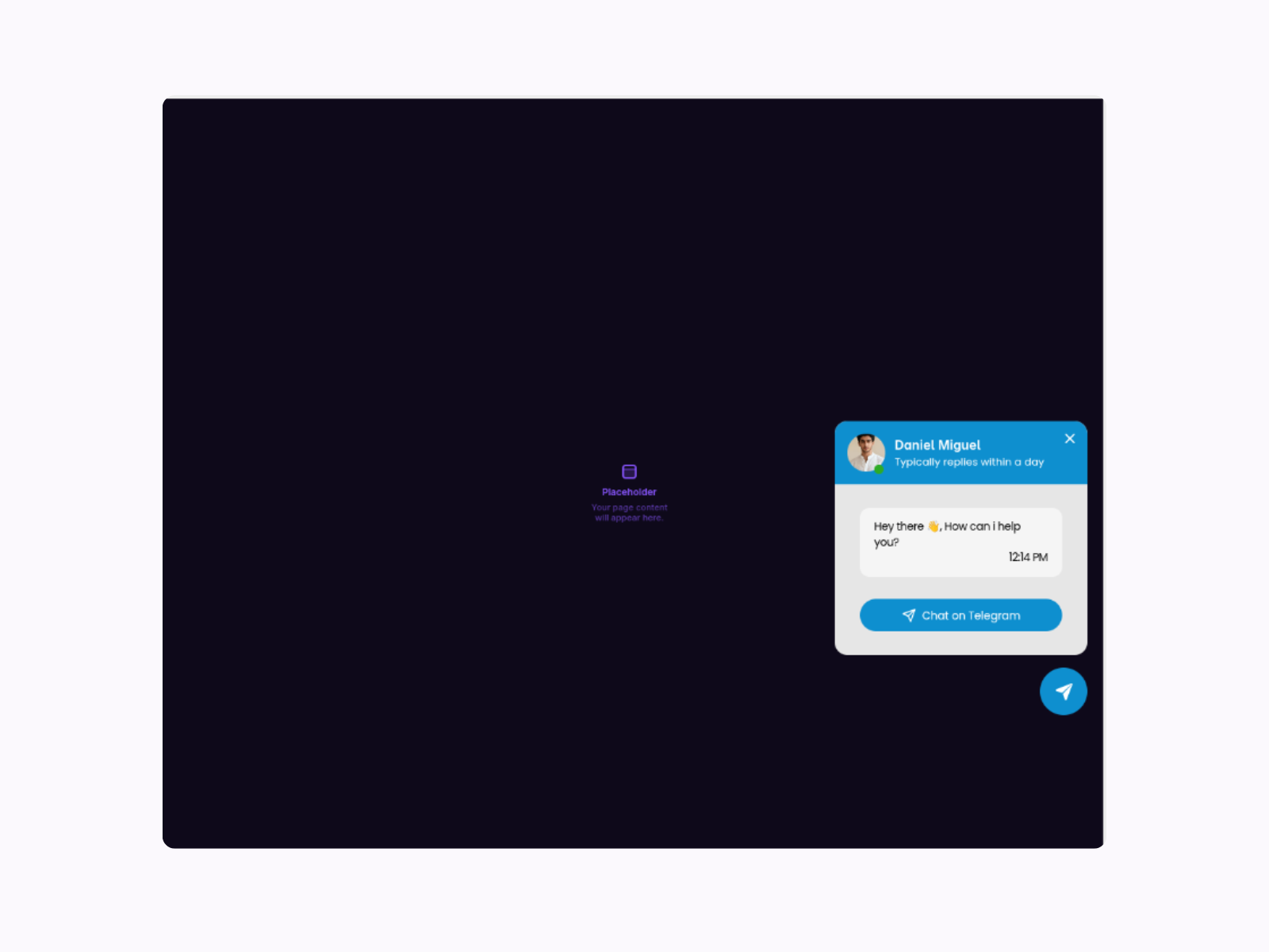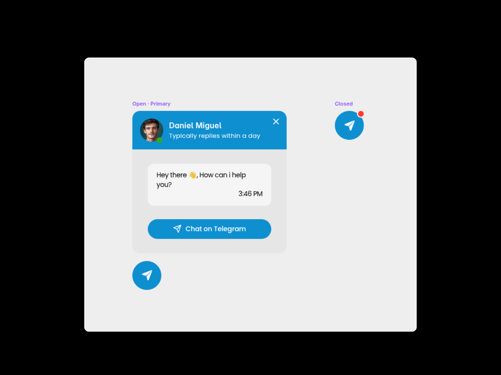 A fully customizable Telegram chat widget for Framer that enables instant communication with your visitors. Ideal for businesses and creators who want to offer fast support, answer questions, and boost engagement through Telegram messaging.