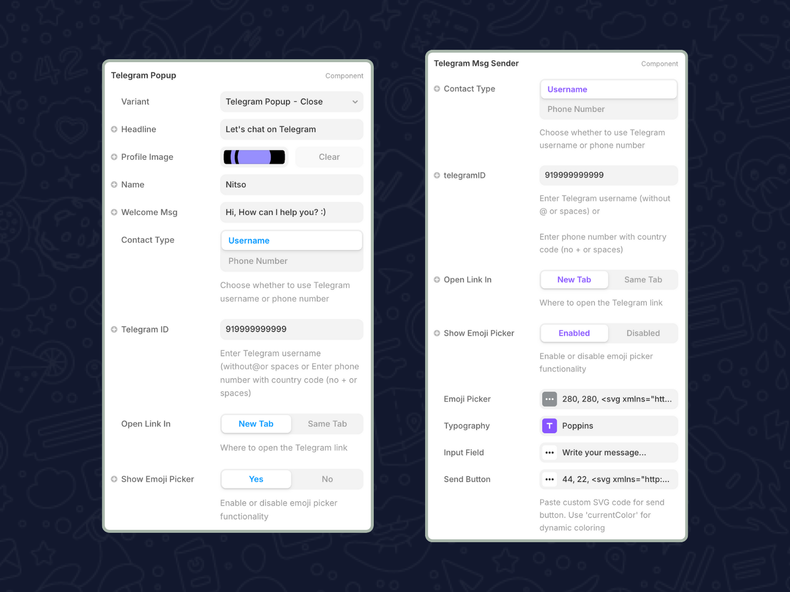 Fully Customizable Design: Every design element is adjustable, from button colors and borders to input fields and typography. Add your custom telegram button style, change padding, set border radius, and modify hover effects - all within Framer. This makes it a versatile social media widget that fits any design system.