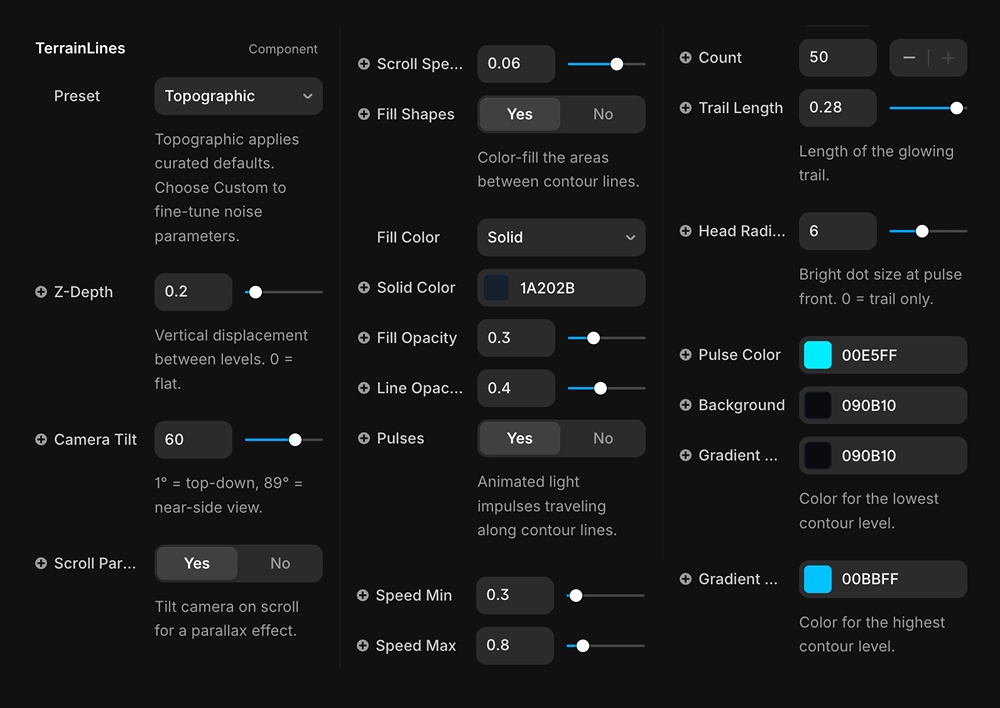 Procedural contour generation from Simplex noise with Fractal Brownian Motion — GPU-rendered pulse animation via custom GLSL shaders (zero per-frame CPU cost) — 3D topographic depth with adjustable Z-displacement and camera tilt — Scroll-driven parallax camera mode — Color gradient mapped to contour elevation — Optional filled terrain shapes between contour lines (gradient or solid color) — Seeded randomness — same seed always produces the same pattern — Visibility-aware — pauses rendering when off-screen to save resources — Responsive — adapts to any container size with ResizeObserver — Full GPU resource cleanup on unmount
