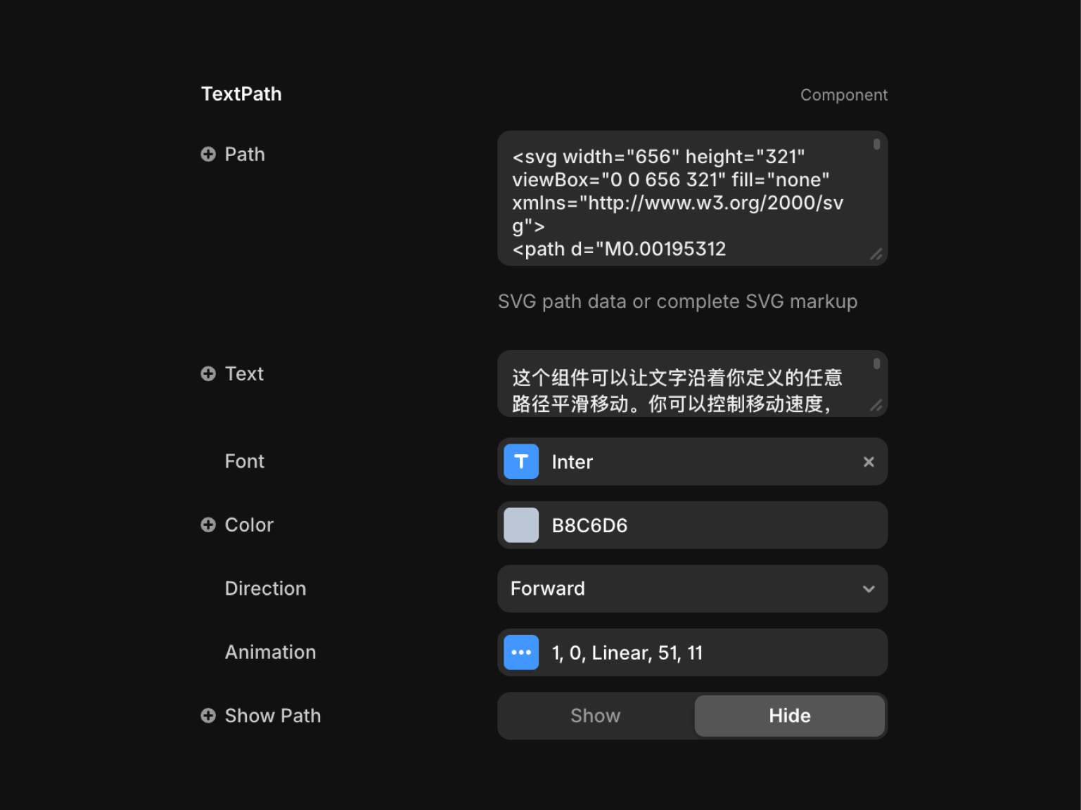The component works by taking SVG path data (either raw path commands or a full SVG snippet) and laying your text along it. You can paste SVG code from design tools like Figma or Illustrator, or write path commands directly. The text measures itself automatically and animates along the path based on your speed and easing settings. You can show or hide the path stroke, adjust its appearance, control where the animation starts, and even make the text repeat multiple times along the path. The direction toggle lets text flow forward or backward along the curve.