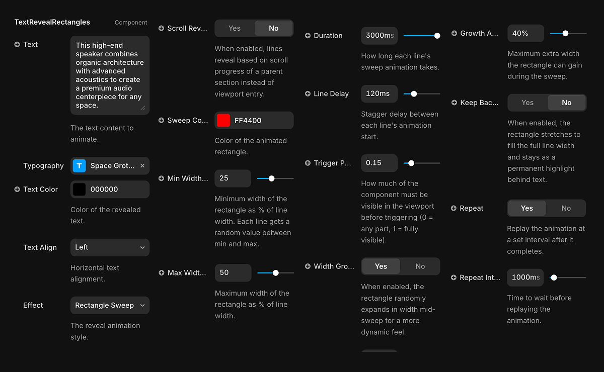 Sweep animation: color, min/max rectangle width (% of line), duration, line-by-line stagger delay, and viewport trigger threshold.