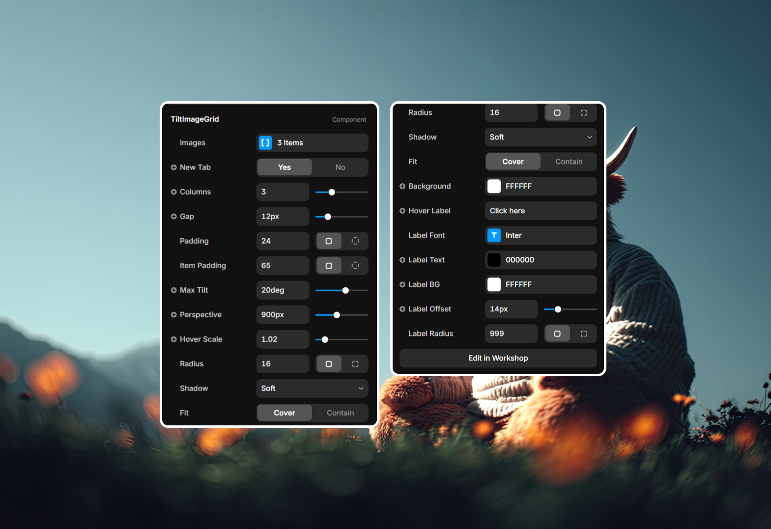 Interactivity: Maximum tilt angle (degrees), 3D perspective depth, hover scale factor, and link behavior (open in new tab).