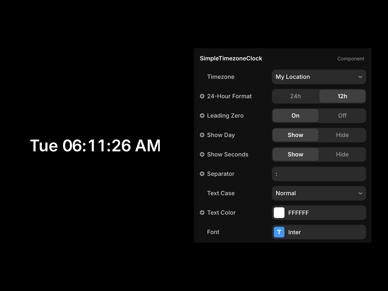 Whether you're a freelancer wanting to show clients what time it is where you are, or building a site that needs a live time display, this component handles it cleanly and stays out of your way.