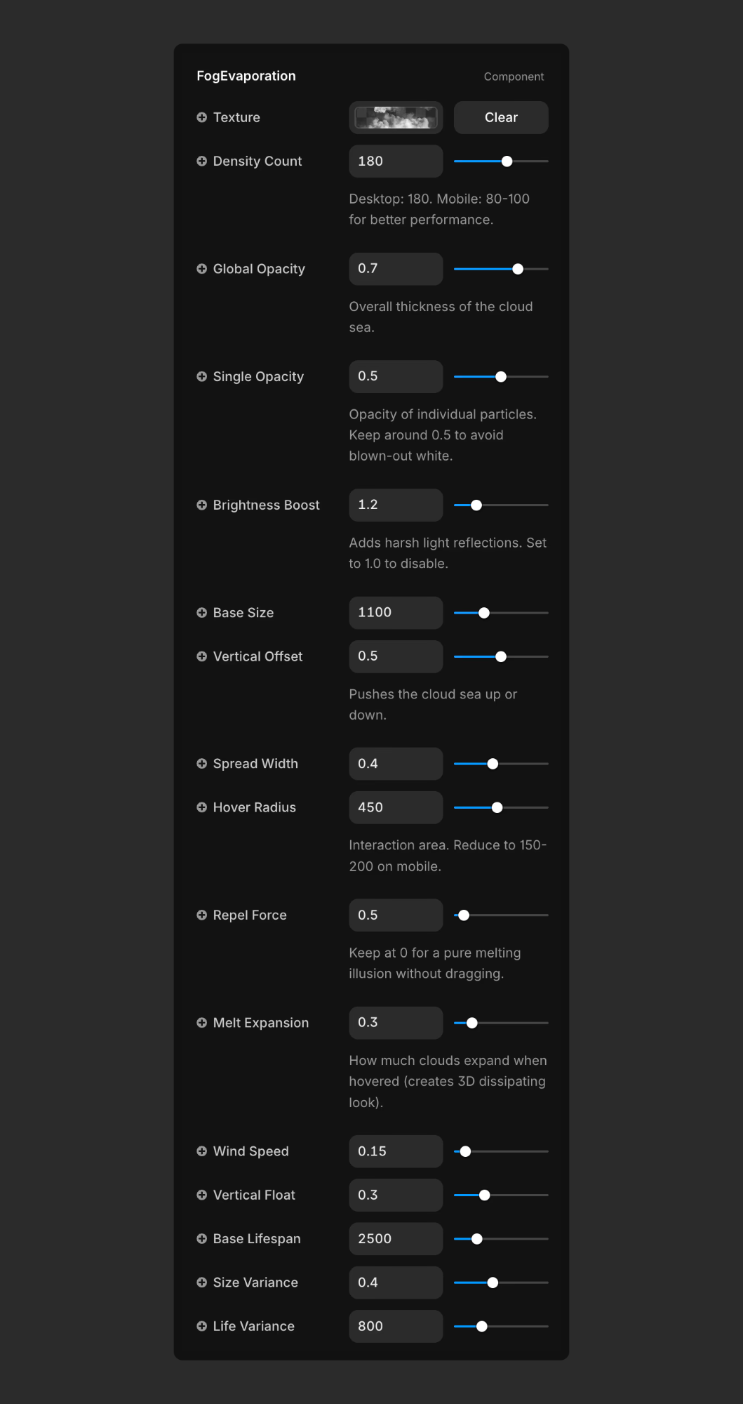 Melt Expansion: Use 0.3 - 0.4. This creates a subtle "puff" before the cloud vanishes, mimicking real vapor physics.