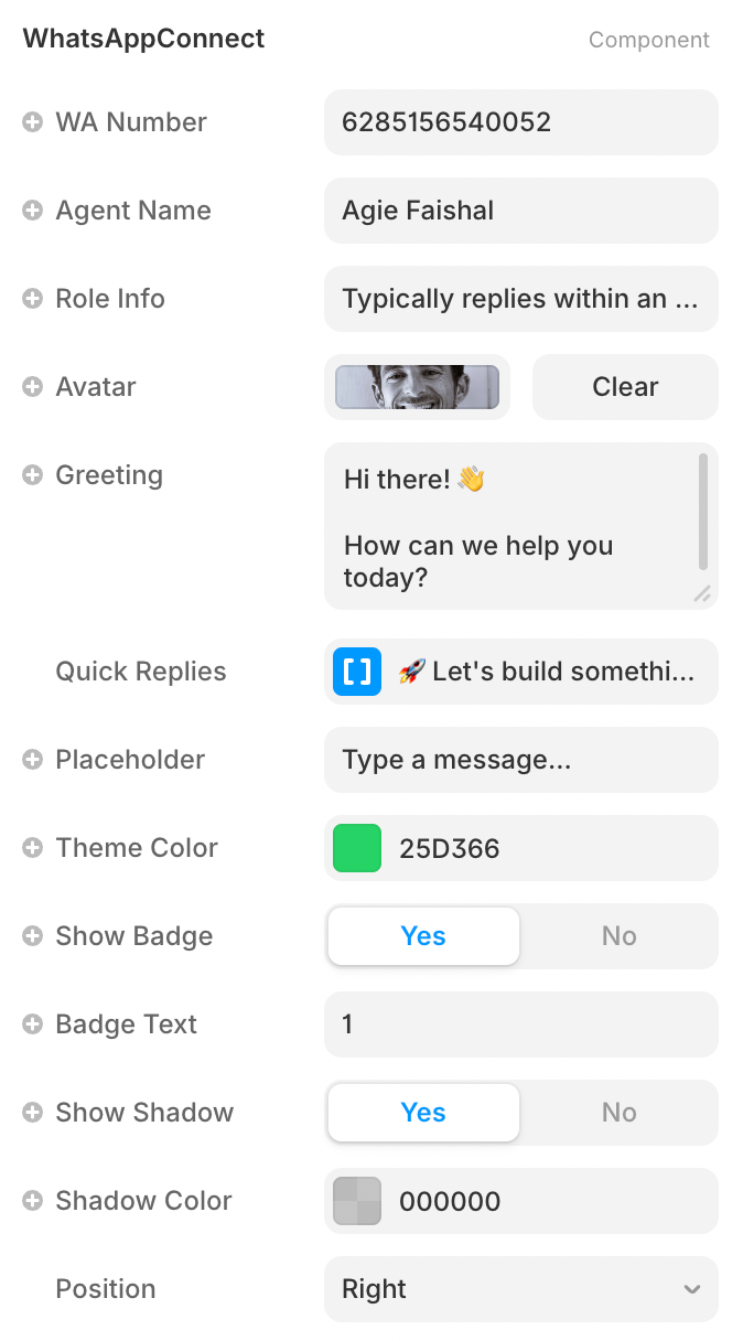 Add your WhatsApp number, and the component automatically cleans the format to prevent broken API links.