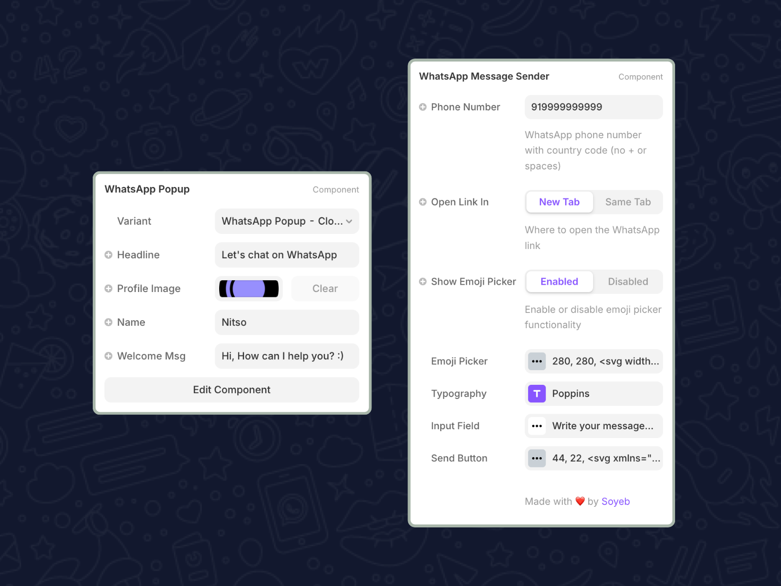 WhatsApp Popup widget with chat interface, emoji picker & message input. Fully customizable. Left/right positions available. Dark mode ready. Complete styling controls included.