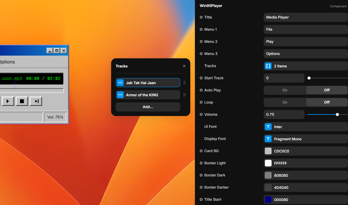 windows 95 framer component · retro audio player framer · win95 media player · nostalgia ui framer · vintage music player component · html5 audio framer · playlist component framer · retro ui component · windows media player clone · framer music player · 90s ui framer · old windows style component · audio player with playlist · framer interactive component · retro design framer