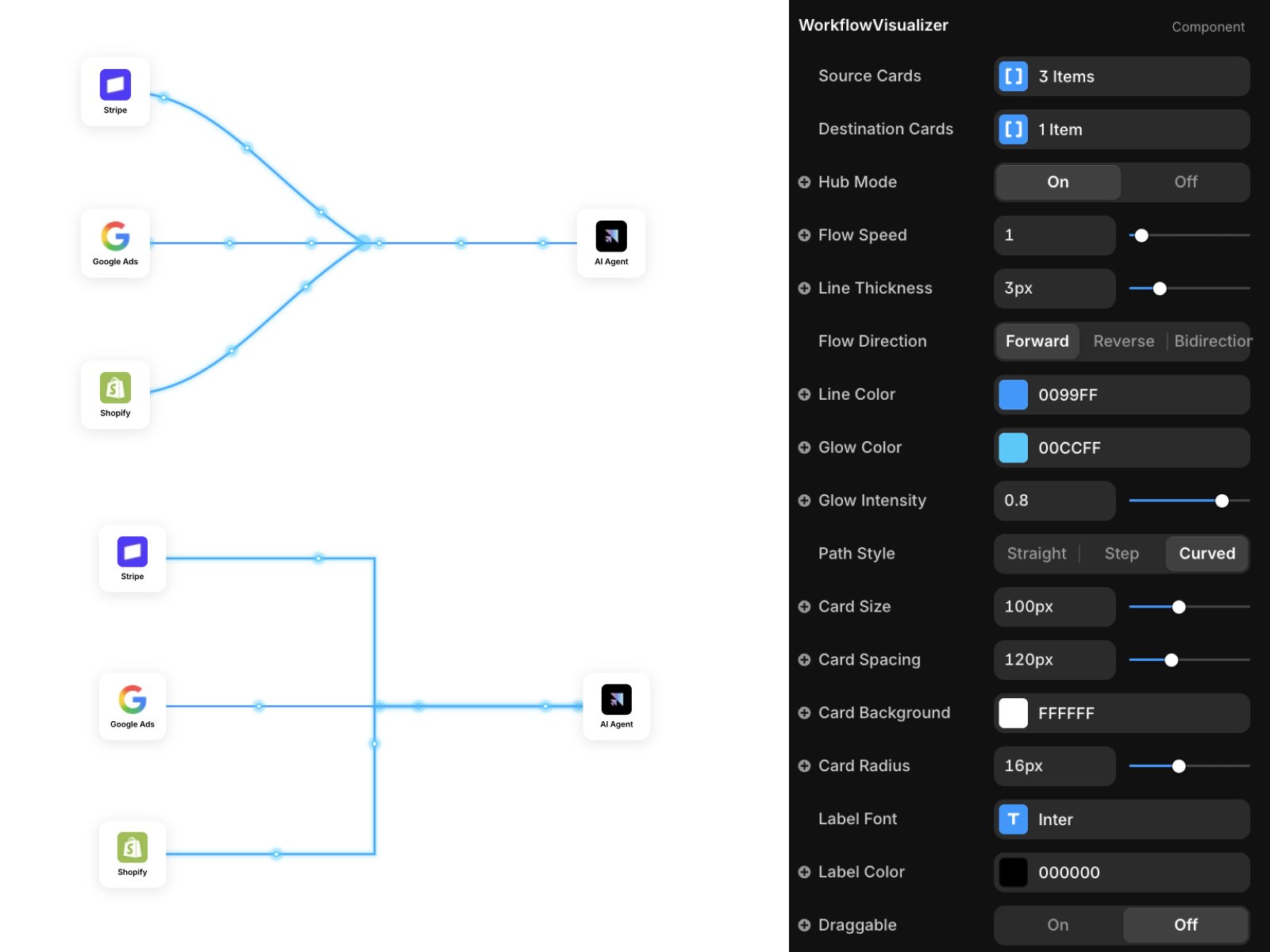 Granular Styling: Control every detail—card radius, background blurs, font weights, line curvature, and glow intensity.