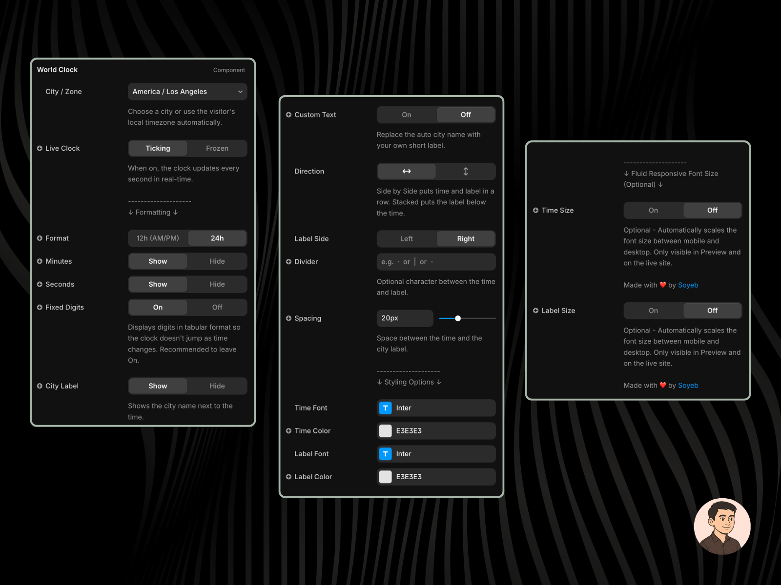 Drop it into your canvas and instantly get a live, accurate time display for any city or timezone. Whether it’s a city time, a global clock, or the visitor’s own local time, everything updates in real time with zero setup.
