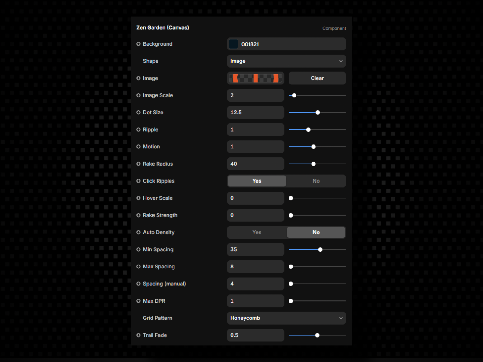 Spice up your website with this customizable interactive background built for Framer. It reacts to cursor movement and touch with smooth, organic motion. The effect simulates raked sand, gentle ripples, and drifting particles in real time, creating a calm and premium surface for hero sections, landing pages, and portfolios.