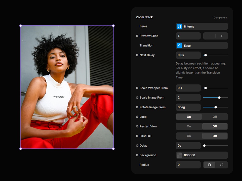 Zoom Stack lets you create layered image animations where each new image scales in and stacks on top of the previous one.