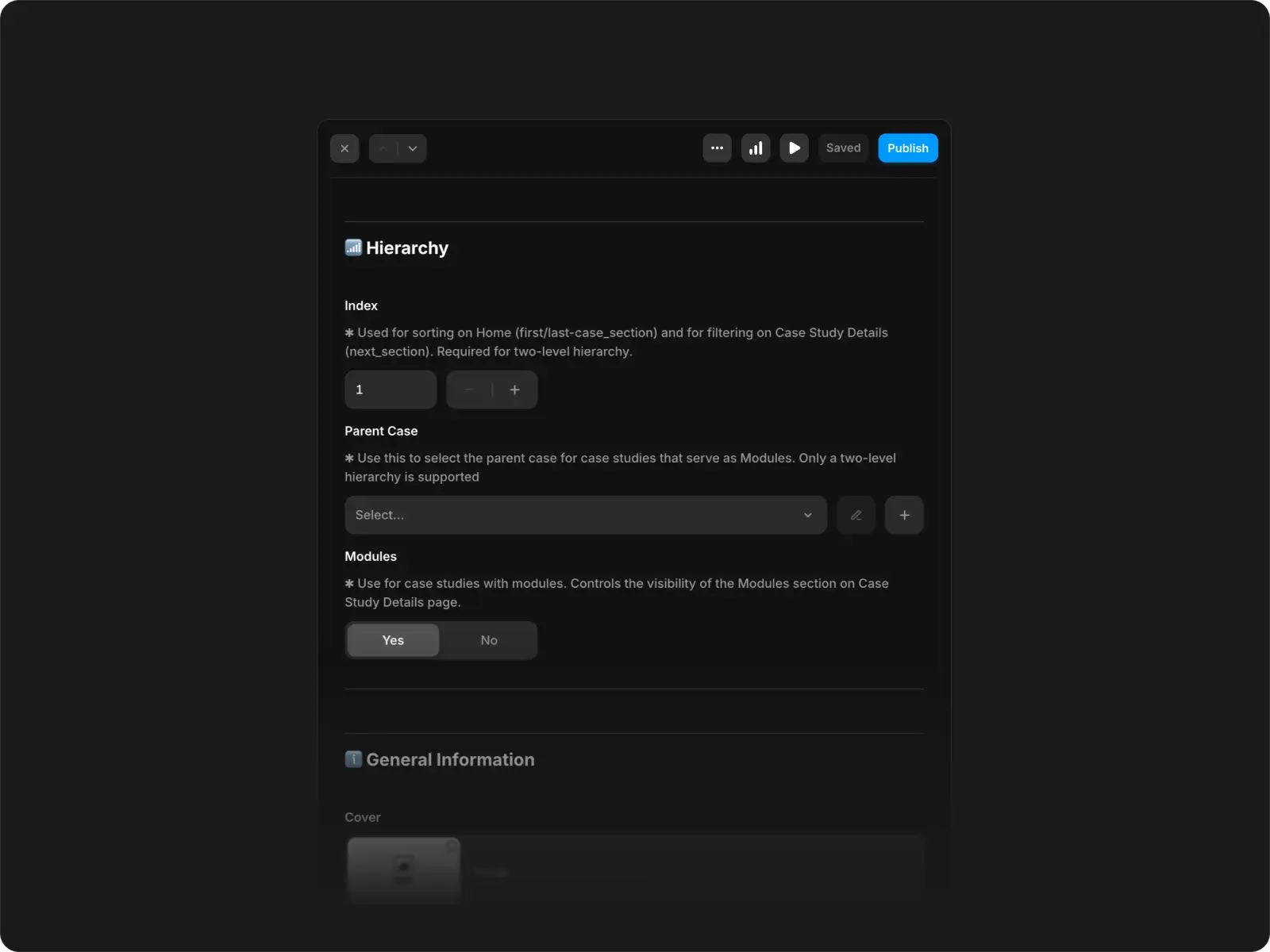 With a single CMS collection, you can build two-level case studies, easily managing both simple projects and complex portfolios. No extra setup needed, perfect for Free and Basic website plans.