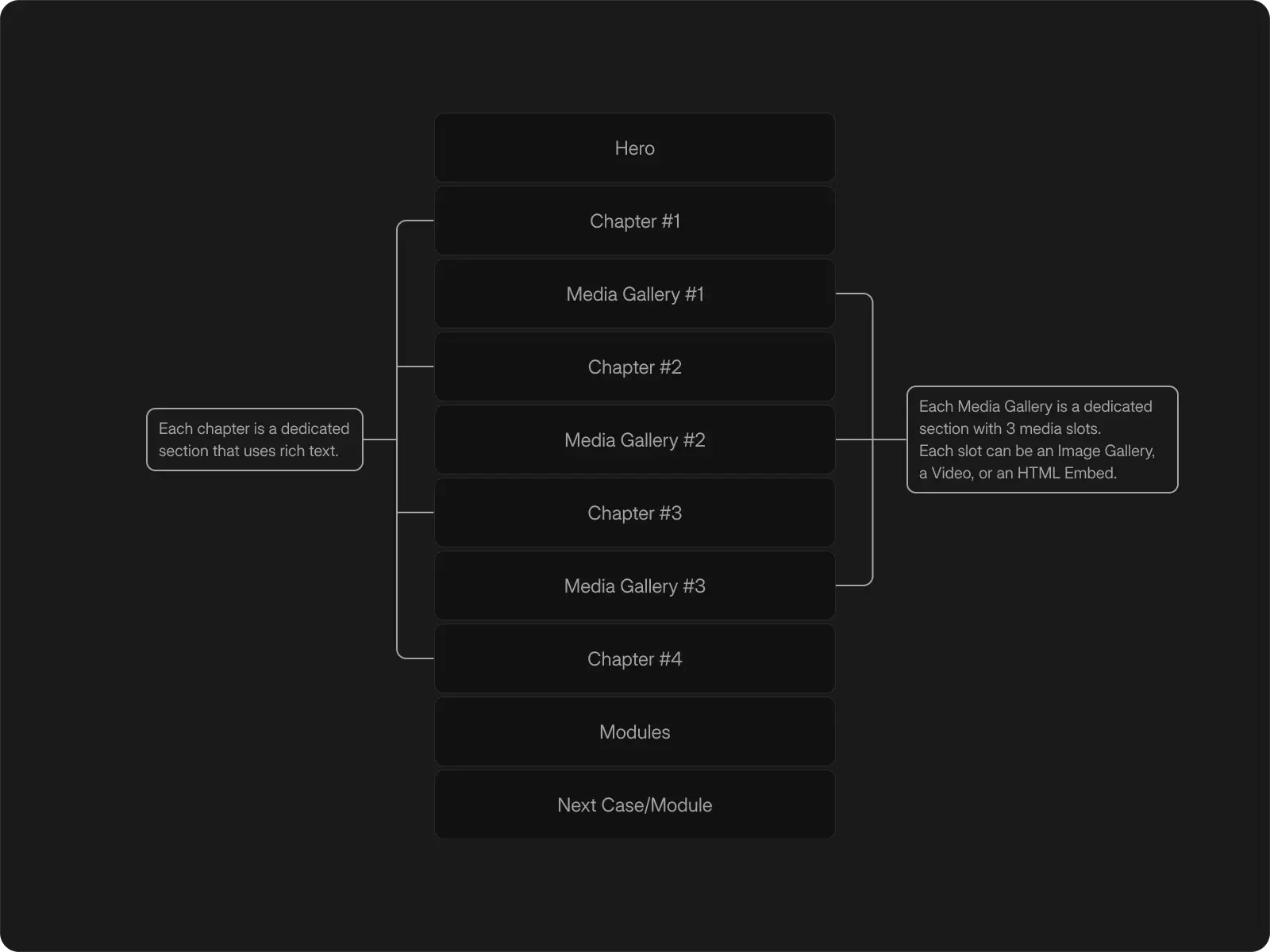 4 rich text chapters and 3 media galleries, each with 3 slots for image galleries, videos, or HTML embeds.