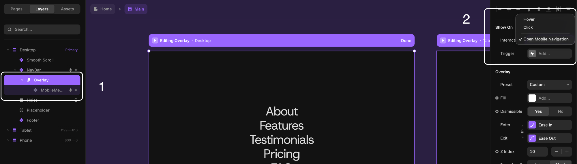 This can be fixed by changing the Overlay → Show On setting to Open Mobile Navigation.