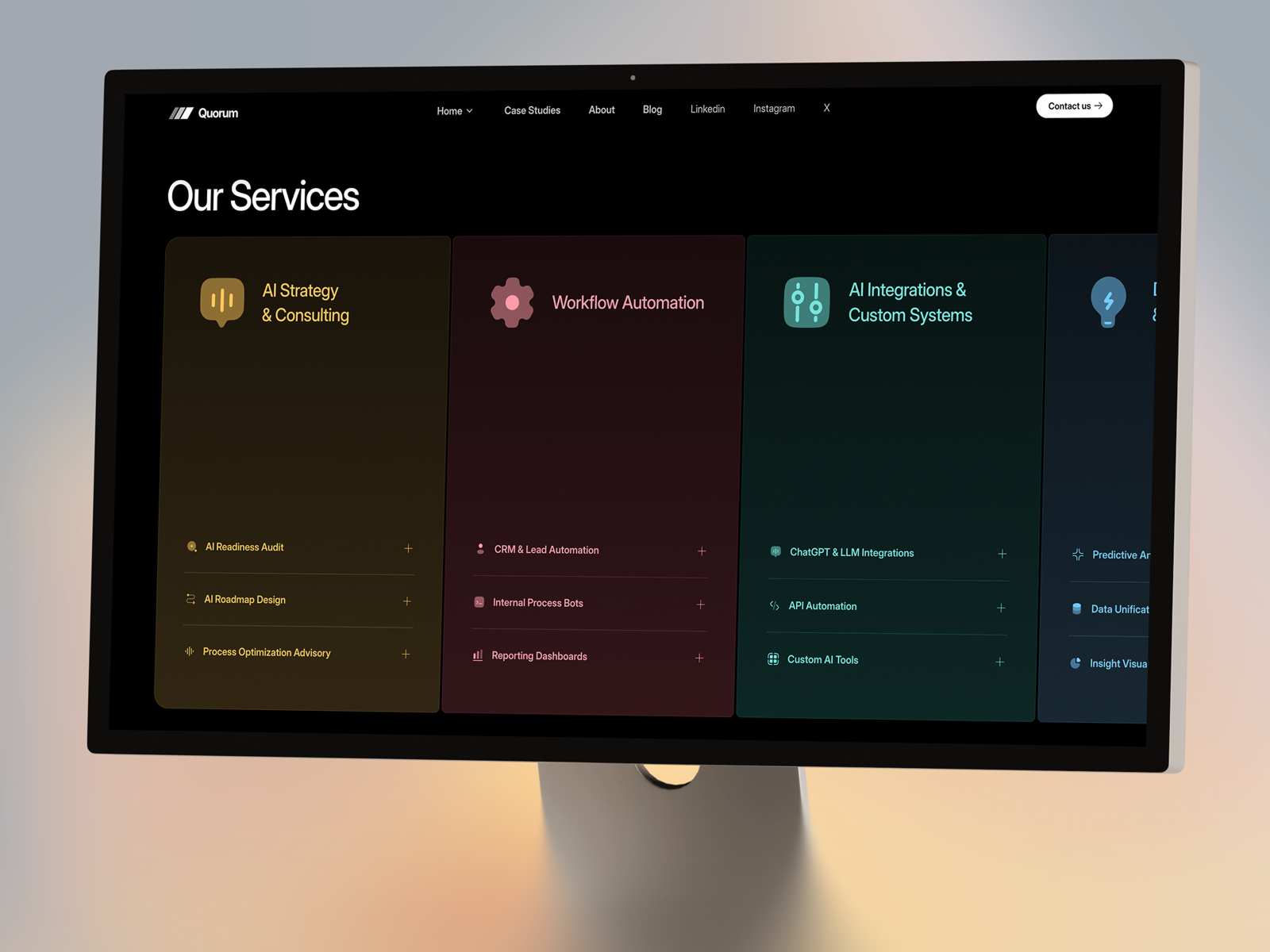 Whether you offer consulting, strategy, automation, or marketing services, Quorum helps you communicate maturity, clarity, and confidence.
