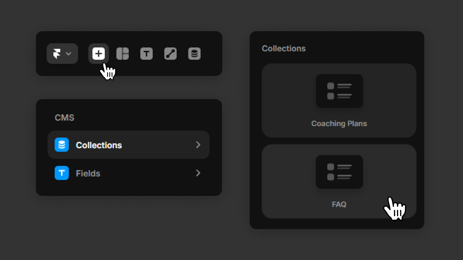 For example, in a FAQ section, you might use a FAQ card component inside the CMS List. You can connect component fields to CMS fields of the same type. For example, text content can use text data from the CMS item.