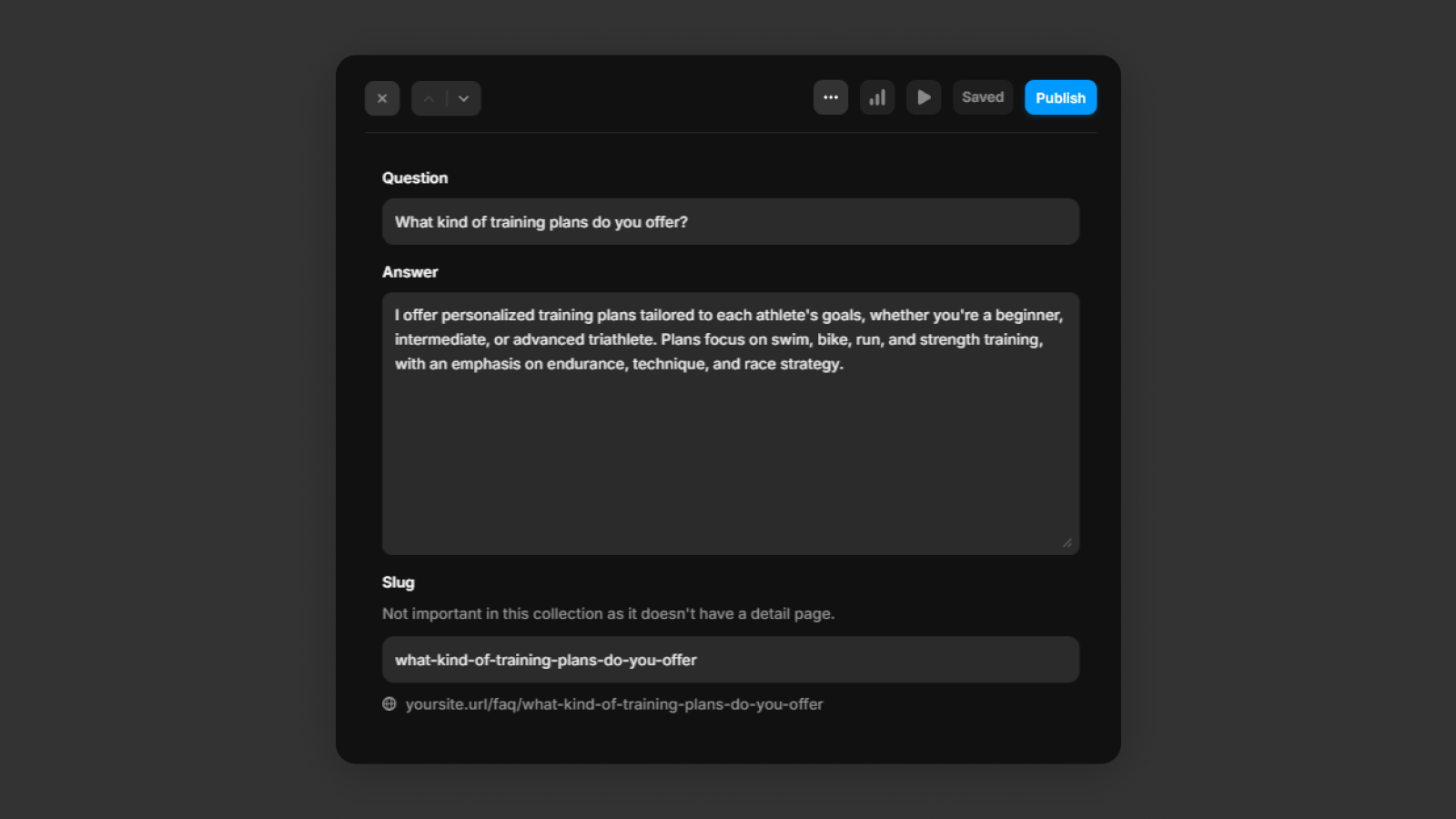 If you open the CMS, you’ll see all available collections in the template. Let’s take the FAQ collection as an example.