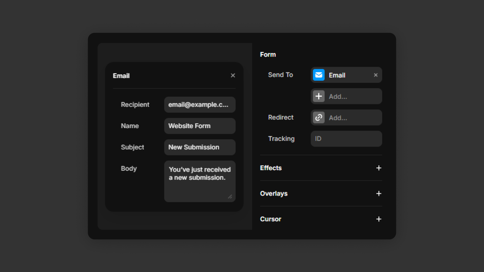 For example, if you select Email, you can enter your email address. When a user submits the form, you’ll receive an email containing all the submitted values.