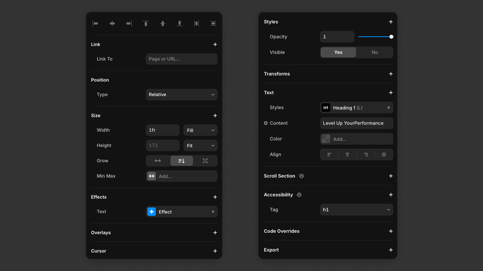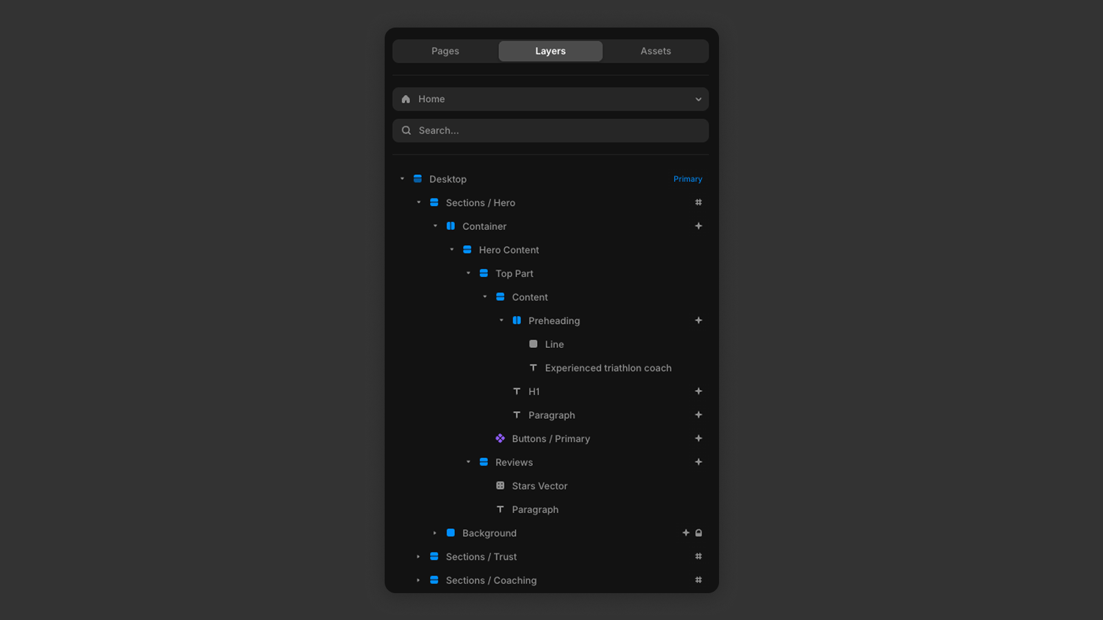 Your site is built from layers and elements that are nested inside each other. Most elements are essentially rectangles within rectangles — you control how they align, how much space they take up, and how they position their content. In the final frames, you then add the actual pieces like text, images, or buttons.