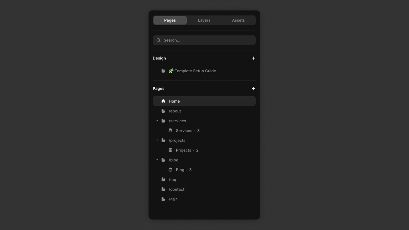 This is where you manage all your pages. You’ll see your main domain (the homepage), and when you add a new page, such as /contact, the link will automatically become yourdomain/contact.