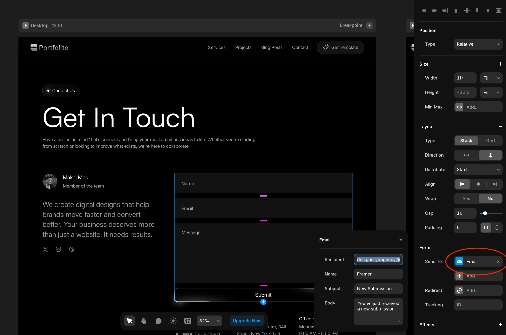 Framer lets you receive contact form submissions directly in your email. The form in this template is already set up. You just need to add your email address.