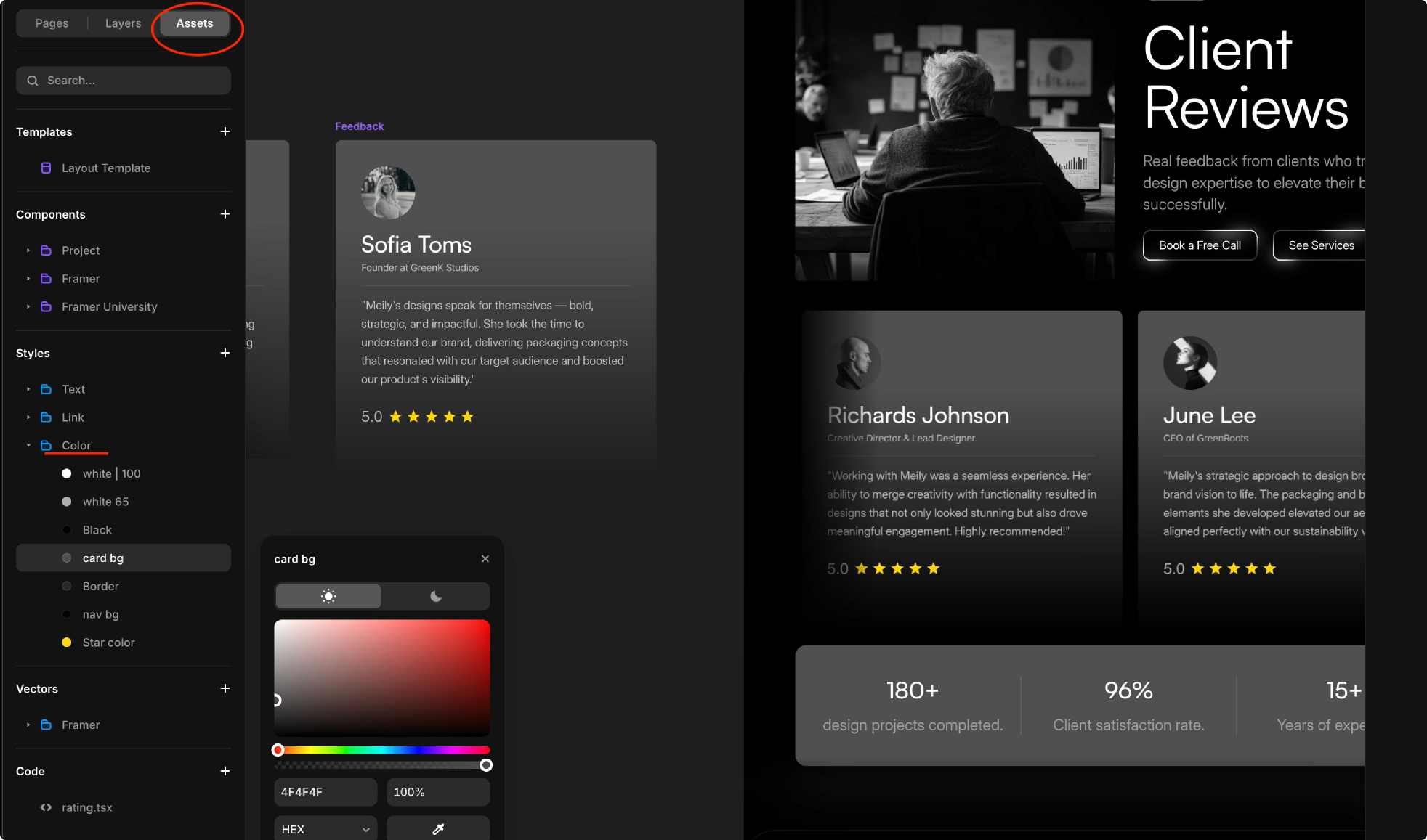 To change colors in Framer, you can do it globally or locally. Global changes update all layers using that color style across the project. Local changes affect only the selected layer or element.