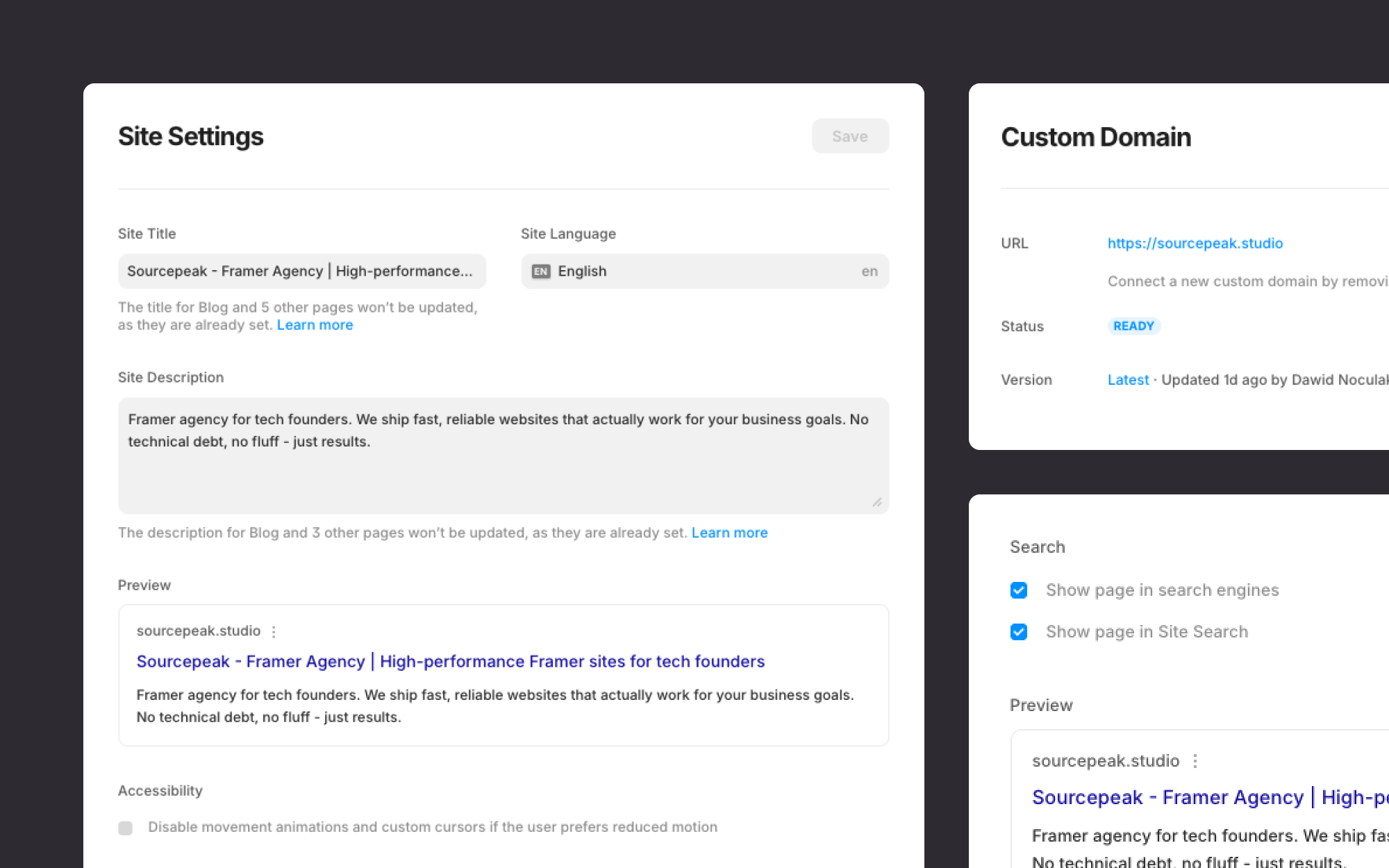 Search Visibility Toggle: Control which pages Google can see. Double-check this before going live so you don't accidentally hide important pages from search results.